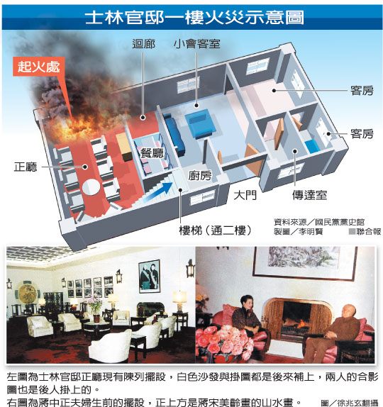 士林官邸包括開放的花園及蔣介石及夫人宋美齡的正房住所,正房是兩層樓水泥建筑,一樓是大會客室,二樓是蔣、宋起居處。前夜起火點在一樓右側的回廊,火苗冒出時觸動保全警報系統。