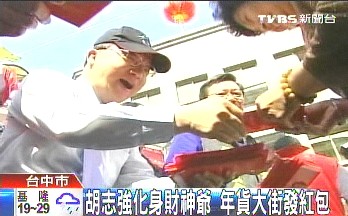 再過幾天就是農歷春節,臺中天津路年貨大街為了增加人氣,請胡志強發紅包,民眾大排長龍,不少小朋友領到市長紅包,嘴巴也變甜了,“祝市長新年快樂,年年有余,大吉大利!”還有一位阿伯為了見到胡志強,連續3年都來領紅包。