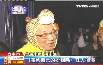 臺中市長胡志強扮成老虎,并圍上一條“老虎圍巾”,所有參加臺中燈會的貴賓坐在位子上整齊劃一,不論穿的是西裝還是休閑服,都在脖子上加了條亮黃色圍巾……這是臺中市府的創意,圍巾左右兩邊是老虎尾巴,做成英文字母T,代表臺中Taichung,還有老虎Tiger。