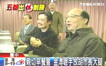 中新網(wǎng)3月11日電 據(jù)臺(tái)灣TVBS報(bào)道,胡志強(qiáng)昨天幽默調(diào)侃了郝龍斌跟馬英九十指相扣,有點(diǎn)吃醋的意味,國民黨秘書長金溥聰今天一大早邀胡志強(qiáng)吃早餐,兩人坐在一起,金溥聰把手放在胡志強(qiáng)大腿上,拉攏的肢體動(dòng)作相當(dāng)刻意,胡志強(qiáng)則表現(xiàn)輕松。