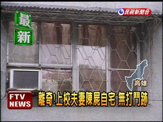 中新網4月19日電 據臺灣民視新聞報道,高雄縣鳳山工協新村18日驚傳一對夫婦陳尸住處的離奇命案,死者是60幾歲,上校退伍的曾清賢,與妻子雙雙陳尸在客廳跟臥房,警方說,由于現場沒有打斗的痕跡,門窗也沒有被破壞,將等檢察官進一步驗尸,確認死因。