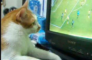 中新網6月22日電 據臺灣“今日新聞”報道,2010世界杯足球賽不僅是全球人們關注的焦點,連貓咪也喜歡,據了解,臺灣一只名叫加菲(GARFIELD)的貓咪,竟然緊貼在電視機前,無比專注地盯著轉播,還會激動地伸出貓爪,對著熒幕又拍又打。