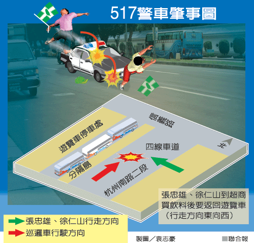 張忠雄、徐仁山在跨越杭州南路車(chē)道時(shí),突遭同由杭州南路南向北行駛的巡邏車(chē)撞上,張忠雄被撞后彈落到巡邏車(chē)擋風(fēng)玻璃上,再滾落地面。由于撞擊力大,巡邏車(chē)的擋風(fēng)玻璃碎裂,原本行駛在內(nèi)側(cè)第二車(chē)道的巡邏車(chē),也偏向最內(nèi)車(chē)道緊急煞車(chē)。