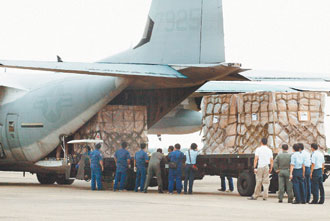 美軍機組人員逐一把標示著“美國陸戰隊”四大箱的防水布推到卡車上,臺灣空軍再把這批物資轉交給到場的聯勤租用貨車。聯勤官員表示,這批防水布物資將載到嘉義、高縣旗山與臺東等地災區使用。