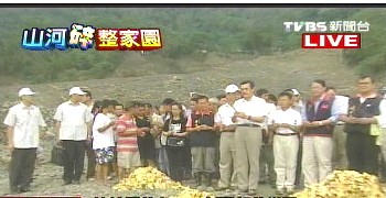 而馬英九到了遭土石掩埋的新開部落,也在當(dāng)?shù)胤傧慵腊萃稣撸袂槟兀辉谶M(jìn)入新開部落前,會(huì)經(jīng)過日前災(zāi)民立牌寫著“32人死亡,SOS”的新寶橋,因?yàn)闃驍嗔耍┕挝幌仍诤哟蹭伾媳愕溃屲囎涌梢酝ㄟ^。