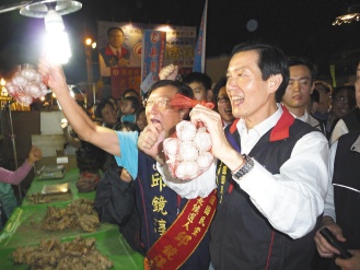 馬英九(右)26日晚在新竹縣陪縣長候選人邱鏡淳(左)掃街,拿起菜攤的蒜頭高喊“凍蒜”。圖片來源:聯合報