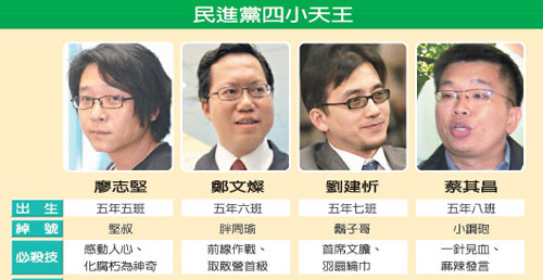 中新網12月14日電 在臺灣縣市長選戰結束后,深受民進黨主席蔡英文倚重的“五年級F4”戰斗團隊成形,民進黨桃園縣長參選人鄭文燦、發言人蔡其昌、政策會首席副執行長劉建忻、文宣部副主任廖志堅,儼然成為民進黨的“四小天王”。