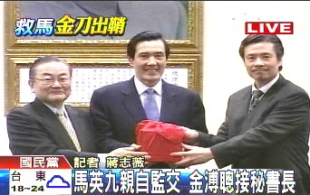 國(guó)民黨新舊秘書(shū)長(zhǎng)交接儀式上,金溥聰從詹春柏與馬英九的手上接下印信,報(bào)道稱(chēng),這象征其扛下國(guó)民黨這部大機(jī)器的開(kāi)始。