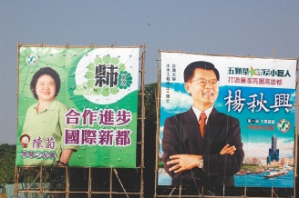 中新網1月18日電 綜合臺灣《聯合報》報道,大高雄市長選舉,民進黨“秋菊之爭”兩人比鄰豎立廣告牌,“合作進步,國際新都”與“五顆星南方小巨人”互別苗頭。