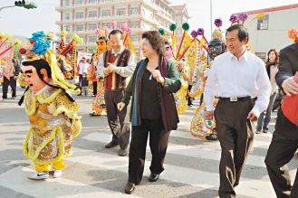 高雄縣阿蓮鄉清和宮舉辦建醮廟會,邀湖內鄉清水寺神祇“監醮”,高雄市長陳菊趁昨天(17日)廟會結束,2鄉民舉行遶境活動,也與信徒一起接神回廟,并和電音三太子舞群跳起臺客舞,令民眾注目。