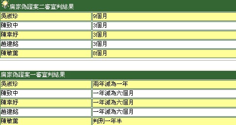 中新網2月3日電 據臺灣TVBS電視新聞報道,今天(3日)下午3點,陳水扁家庭成員被控偽證案在臺灣高等法院二審宣判,吳淑珍被判1年6個月,減刑為9個月,陳致中、陳幸妤及丈夫趙建銘判刑6個月,減刑為3個月,陳敏熏被判刑8個月。五人判決都比一審輕。