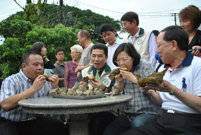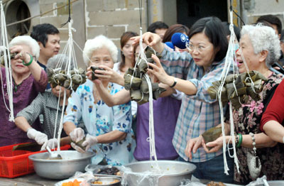 中新網6月13日電 據“中央社”報道,民進黨新北市長參選人蔡英文13日到臺北縣貢寮鄉三合院與婆婆媽媽一起包粽子,第1次包粽子的她在旁人協助下,包了3個。她說,包粽子最困難是“把它(指粽子)合起來”。
