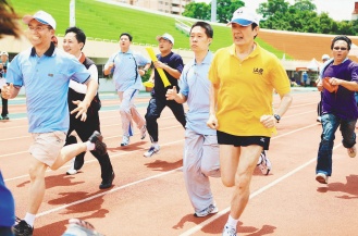 馬英九(右)昨南下鳳山,與黨工一起賽跑,他希望打造臺灣成為“體育島”。 圖片來源:臺灣《聯合報》