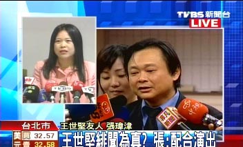 中新網10月22日電 民進黨“立委”王世堅去年8月被媒體拍到和女助理上賓館,他當時解釋是和助理到旅館聽選民張瑋津爆料內幕,不過,現在張瑋津卻翻供,當時是配合王世堅制作假錄音帶,假裝爆料,一切的劇情都是王世堅的安排,說謊是為了幫助王世堅。