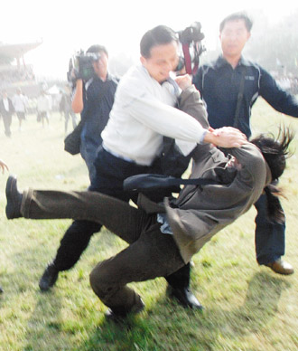 中新網11月12日電 陳水扁昨天兩度被嗆聲。先是在臺南成大,嗆扁的王姓女學生被安全人員過肩摔。稍后在一個工業區,抗議人士氣得大罵:“自從我們投票選他(陳水扁)當,他人都變了!”