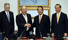 據“中央社”報道,宋楚瑜上午在秘書長秦金生等人陪同下前往國民黨中央拜會吳伯雄,兩人晤談后共同召開記者會。吳伯雄表示,國親必須奮發來救臺灣,為臺灣兩千三百萬人民留一點生計,這是國親共同的愿望。