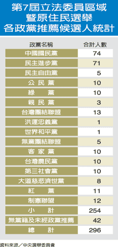首次采單一選區(qū)兩票制的第七屆“立委”選舉,區(qū)域“立委”與原住民方面將選出79席,共16個政黨推薦254人參選,無黨籍及未經(jīng)政黨推薦的有42人。