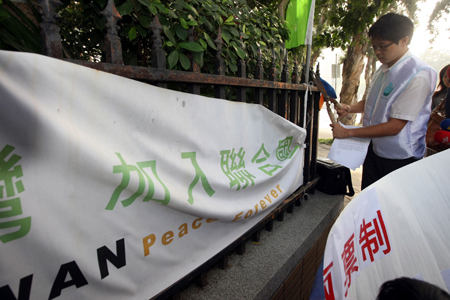 他們除在“行政院”圍墻掛上“一票投人、一票投黨”布條,也打算將標語貼在門口的“入聯(lián)”牌樓上,但遭警方制止,最后改貼在門口柱子上。