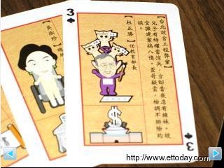 除了陳水扁以外,“紅心Q”上的陳水扁之妻吳淑珍拿著發(fā)票,旁邊寫“忙搜集股票、禮卷與發(fā)票。貪污被起訴。金孫穿戴英國名牌、吃高檔料理、都報公帳”;另外民進黨2008參選人謝長廷,則在“方塊A”出現(xiàn),牌面寫著“立委謝長廷、跪拜宋七力、宇宙光明禮、一本賣兩萬”。