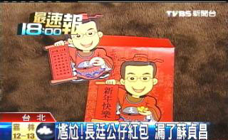 據(jù)臺(tái)灣TVBS報(bào)道,謝長廷近日推出長廷公仔紅包,不過,拿來跟藍(lán)營的馬蕭配紅包一比,造型是活潑許多,但馬蕭紅包中規(guī)中矩、兩人大名并列;長仔紅包卻獨(dú)漏副手蘇貞昌?
