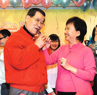 蕭萬長參加情人節活動 與夫人互喂巧克力(圖)
