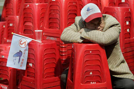 謝長廷的競(jìng)選總部位于至圣路與博愛路口,是他2003年蟬聯(lián)高雄市長的福地。當(dāng)初謝選擇這里,不排除有“風(fēng)水寶地”的考慮。但3月8日當(dāng)天,這里已經(jīng)完全被裝點(diǎn)成親子樂園。大門外的廣場(chǎng)上擺放著可容納數(shù)十名兒童的玩具蹦床、兩人多高的埃及獅身人面像充氣玩偶、五彩繽紛的氣球門,廣場(chǎng)一角上演著龜兔賽跑的兒童劇。總部?jī)?nèi)更是熱鬧,真人扮演的毛毛蟲、花朵跑來跑去;模仿哈利波特巫師裝扮的選務(wù)人員,也在熱心地教小朋友們做游戲。