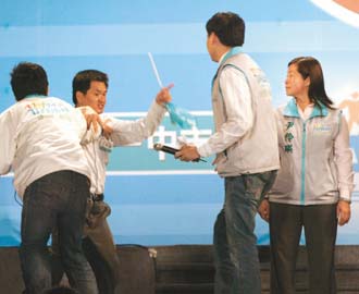 中新網3月19日電 民進黨2008參選人謝長廷的競選總干事李應元,策動“臺聯黨”前“立委”尹伶瑛重返民進黨,昨(18日)晚在云林縣挺長昌造勢大會上邀尹伶瑛上臺,卻引發部分支持者強烈反彈,試圖沖上臺抗議,場面尷尬。