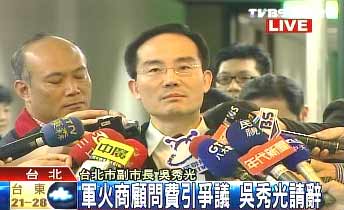 中新網4月24日電 據臺灣TVBS報道,被雜志報道疑似收受軍火商顧問費引發爭論的臺北市副市長吳秀光,23日大動作控告媒體以及民進黨民意代表后,原本說不再發言的他,下午4點再度召開記者會。