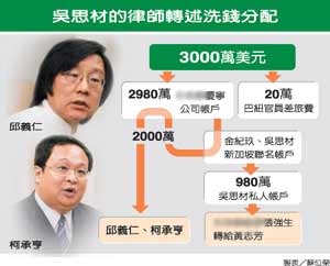 據臺灣《聯合報》報道,徐景星說,根據吳思材留下的洗錢分配流程數據及吳思材先前告訴他,臺涉外部門透過辦理“機密外交”常使用的一家人頭公司(慶寧公司)賬戶,先將兩千九百八十萬美元匯到金紀玖和吳思材在新加坡銀行開立的聯名賬戶內;其中九百八十萬美元,金紀玖對吳思材說:“老板(邱義仁)指示要把九百八十萬匯到你個人賬戶內。”于是吳和金紀玖辦理轉匯,當時張瓊森也在場。