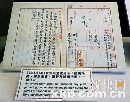 臺“總統府”9日上午開放民眾參觀,展覽室內展出歷任“總統”文物及公文稿,據臺灣媒體9日報道,其中包括1988年蔣經國逝世時,馬英九受命用毛筆撰寫的緊急處分令真跡,規范在“國喪”期間,全臺禁止聚眾集會、游行、請愿等活動,當時馬英九是“總統府”第一局副局長,簽出來的文稿還要層層上報,由長官批示,最后由繼任“總統”的李登輝批定。