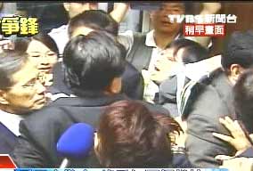 經劉盛良幾度宣布休息進行協商,仍無法平息藍綠“立委”的爭議,此時趕來的民進黨、國民黨“立委”愈來愈多,在國民黨“立委”周守訓要求先進行會議詢答、蔣孝嚴提出散會動議后,雙方沖突一觸即發。