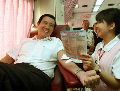 據“中央社”報道,馬英九23日參加捐血活動并接見全臺40位績優捐血人,其中40歲的崔德龍(分離術)捐血達911次、60歲的鄭敬瀚(全血)捐血達241次。