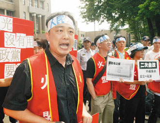 “人民火大聯(lián)盟”昨天到民進黨中央抗議,活躍于社運界、同時也是民進黨秘書長王拓兒子的王醒之(左二)帶頭喊口號