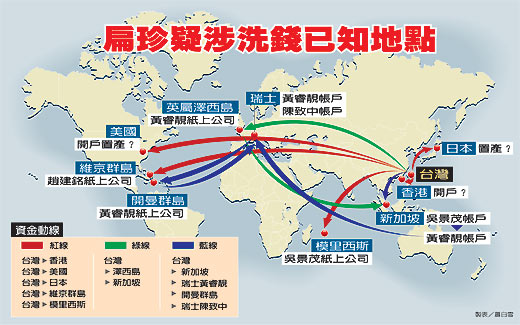 中新網(wǎng)8月30日電 據(jù)臺灣《聯(lián)合報》報道,臺灣“最高檢“特偵組追查陳水扁家庭海外密帳,發(fā)現(xiàn)陳水扁家的資金,曾在臺灣以外至少四大洲的十個國家或地區(qū)流轉(zhuǎn),包括被視為洗錢天堂的英屬開曼群島、澤西島等地,金額疑超過十億元(新臺幣,下同);檢方認為陳水扁家在日本、美國也有資產(chǎn),正過濾、查證相關(guān)情資。