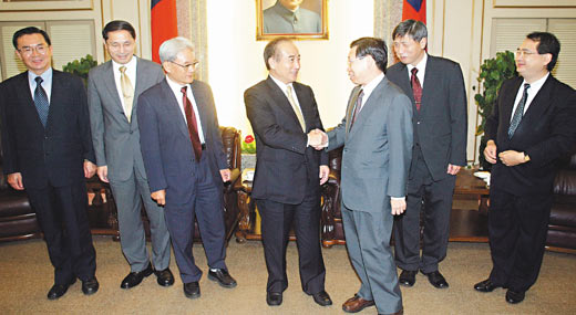 臺灣“司法院”新任“大法官”(左起)葉百修、陳春生、黃茂榮,陳新民(右一)、陳敏(右二),3日由“司法院秘書長”謝文定(右三)帶隊拜會臺“立法院長”王金平(右四)。(圖:臺灣《聯合報》)