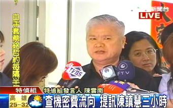 特偵組發(fā)言人陳云南表示,借提陳水扁任內(nèi)出納陳鎮(zhèn)慧、前陳水扁辦公室主任林德訓出庭,最主要是要厘清整個機要費的流向以及金額細節(jié)部分。(圖片來源:臺灣TVBS)
