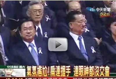 此時,馬英九起身回禮,扁、馬短暫交流,隨后陳水扁和“副總統”蕭萬長夫人朱俶賢及“前副總統”連戰也握手致意,但馬英九之前見陳水扁上前還禮貌起身,相形之下,朱俶賢與連戰則是坐著握手,一旁的連方瑀連看都不想看陳水扁。