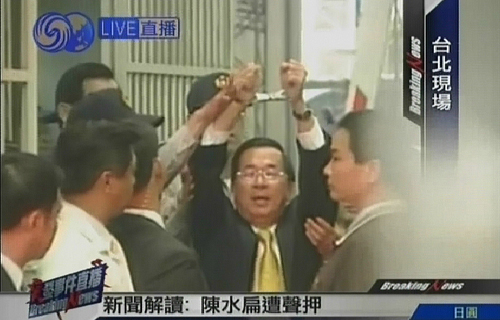 臺灣“今日新聞”報道說,陳水扁下午4時30分許步出特偵組準備上車時,面對媒體高舉銬著手銬的雙手,喊完口號才上車,一副從容就義的模樣,顯然有備而來。