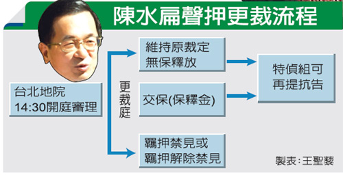 臺北地方法院下午更裁定可能出現“維持無保釋放”、“交保”、“羈押禁見或羈押但解除禁見”三種情形,特偵組只會接受“羈押禁見或羈押解除禁見”一種。