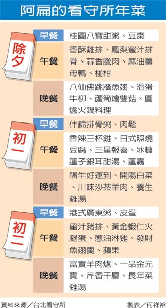 而春節即將來臨,所方已經依往例規劃好過年菜色,除夕至初二的三天都有加菜,必須在看守所過年的阿扁,可以吃到“八仙佛跳墻魚翅”、“滑蛋牛柳”、“蘆筍燴雙菇”及“圍爐火鍋料湯”等年菜。