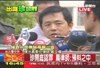 中新網2月10日電 據臺灣TVBS報道,陳水扁夫人吳淑珍今天(10日)出庭應訊,當庭承認偽造文書和洗錢罪,對此,陳水扁委任律師鄭文龍表示,早在預料之中。