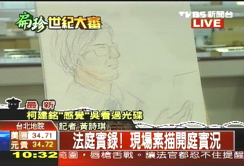 而在法庭內(nèi)的素描,坐在被告席上的陳水扁看來有些駝背,面前擺著一臺(tái)計(jì)算機(jī),所有對(duì)話都會(huì)在計(jì)算機(jī)中顯現(xiàn)出來,在被告席左邊的是律師席,坐著陳水扁律師鄭文龍,而被告席正對(duì)面就是審判者蔡守訓(xùn),蔡守訓(xùn)一開始問陳水扁是不是心跳加速、會(huì)氣喘?陳水扁連話都沒有說,只是點(diǎn)點(diǎn)頭,低頭看著計(jì)算機(jī)屏幕。