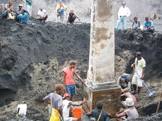 由于碑體幾乎被火山灰覆蓋,項目小組遂請當?shù)貎S民協(xié)助開挖,原先因干熱土質極硬,小組原擔心挖掘會不順,但開挖前晚又下大雨,土質變軟,第二天又變成涼爽陰天,挖掘相當順利,很快就讓整個紀念碑完整露出,上刻“中國廣東民眾死亡紀念碑”。