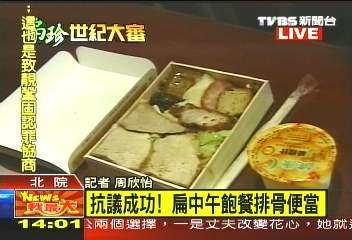 不過抱怨還是有效的,中午陳水扁的午餐已換成價值70元的排骨便當。臺北地方法院經過開會決定,只要是整天庭訊的人,臺北法院中午就會準備一個便當,若是連續兩天開庭的話,晚餐也會準備便當供出庭的人食用。