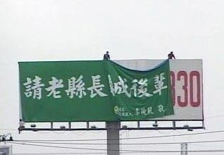 李俊毅在中山高永康交流道北上路段架設“請老縣長牽成后輩”廣告牌,希望能勸退陳唐山。圖片來源:臺灣“今日新聞”