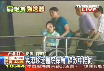 中新網5月11日電 據臺灣TVBS報道,陳水扁因為絕食身體虛弱遭到強制送醫,目前仍在臺北縣立板橋醫院接受治療。陳水扁夫人吳淑珍偕同兒子陳致中11日上午來醫院特見陳水扁。