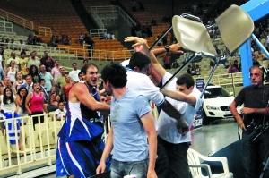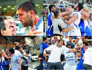 昨天的比賽臨近結束時,希臘隊當時以74比73領先塞爾維亞,隨后雙方兩名無球隊員產生口角,并發展成肢體沖突。而后發生了最殘酷的一幕,塞爾維亞隊隊長、效力于NBA雷霆隊的科斯蒂奇卷入沖突,他抓起一把椅子丟向比賽中與其對位的希臘隊中鋒肖特薩尼蒂斯,不料椅子卻擊中因傷坐在希臘隊替補席上的布魯西斯,后者頭部頓時鮮血直流。此后有多名球員卷入此次群毆事件,現場亂作一團。據美聯社報道,雙方后在球員通道內再次發生斗毆。而就在這起惡性打架事件發生前6分鐘左右,塞爾維亞隊主帥伊夫科維奇因與主裁判發生沖突而被吹了兩次技術犯規,最終被逐出場。