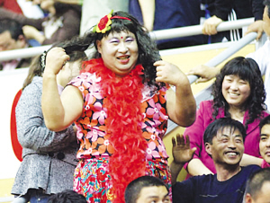 昨天的南京奧體看臺上,還來了一位貌似乳神的人,這究竟是什么回事呢?昨天比賽還沒開始,奧體中心體育場的50區看臺就熱鬧無比。很多球迷紛紛圍到一名打扮性感的人邊上,爭相與“她”合影。而本報記者也從內場走到看臺附近一探究竟。原來,這是一位老舜天球迷,聞之巴拉圭正版乳神因故未能前來南京,為了彌補大家的遺憾,也是順便活躍一下現場氣氛,照著巴拉圭乳神里克爾梅的外形好好地裝扮了一下自己。由于這位男球迷是反串表演,所以他還特意用材料加以修飾,讓自己胸部的豐滿程度更加接近于乳神。于是,他便成為了昨天現場最為“耀眼”的明星,受歡迎程度甚至超過了巴拉圭球星圣克魯斯。除了這位比較搞怪的球迷,昨天來自全國各地的著名球迷也聚集奧體中心,“羅西”、“胖哥”等等耳熟能詳的名字為南京奧體中心的這場中巴之戰增色不少。