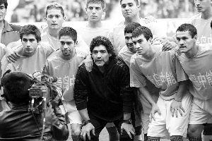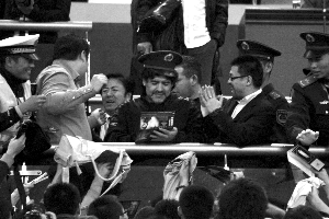 按照此次溫暖中國行的計劃,馬拉多納帶領(lǐng)的阿根廷隊將與李明領(lǐng)銜的山東國腳進(jìn)行一場義賽,所得款項捐獻(xiàn)給中國紅十字基金會,屆時老馬將會親自登場比賽。下午14時30分左右,奧體中心體育場已經(jīng)坐了一大半球迷,有人穿著阿根廷國家隊的藍(lán)白球衣,有人舉著紀(jì)念圍巾。球場上兩支隊伍在熱身,并不見主角馬拉多納的影子,工作人員稱他還在飛機上。