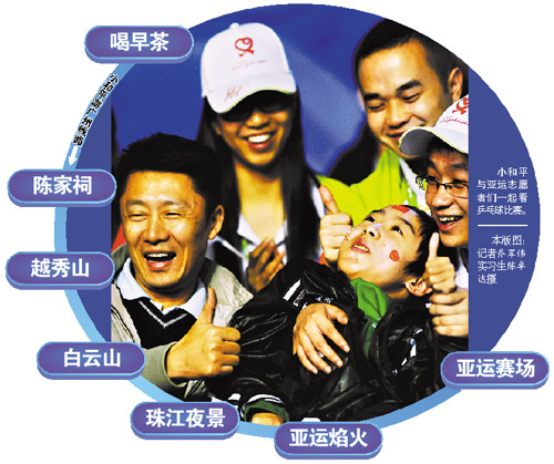 喝早茶、逛陳家祠、在五羊雕塑下照全家!驮趤嗊\開幕當天,由本報發起的“圓夢愛心團”帶著來自四川的絕癥少年小和平游廣州、嘗美食。昨天早上,在愛心團的陪護下,小和平又來到離醫院最近的廣州體育館,觀看中國隊與伊朗隊的乒乓球男雙比賽,這是他第一次現場看球賽。